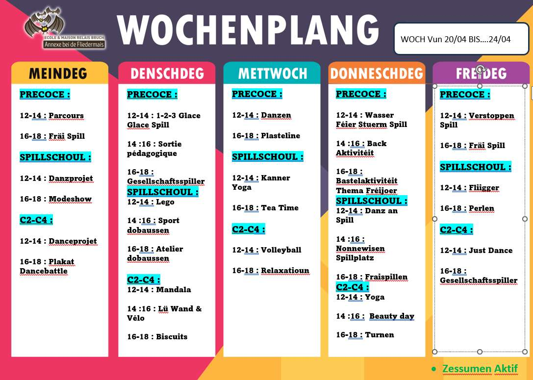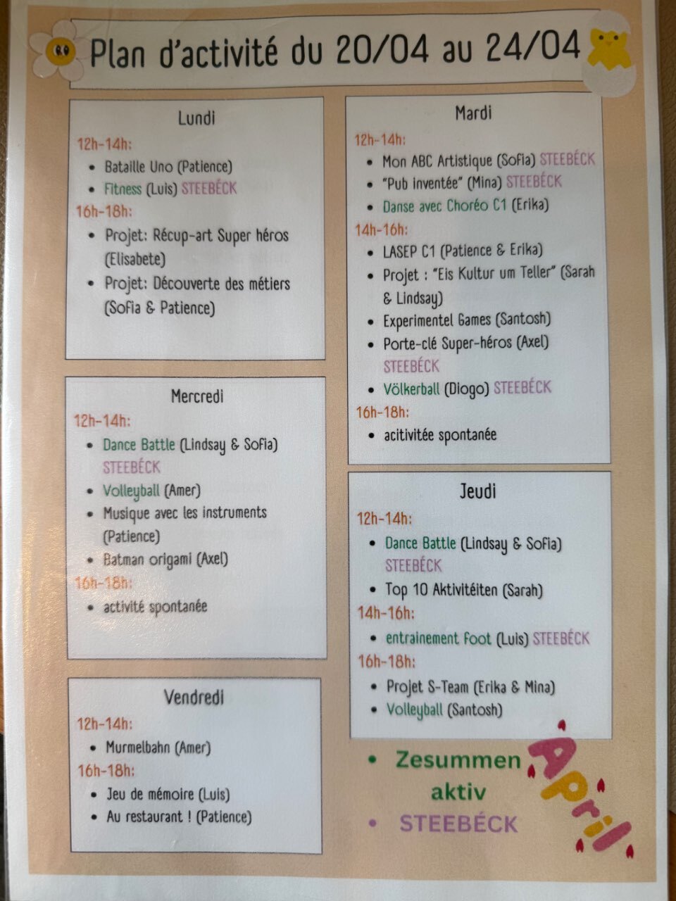 Plan d'activité semaine du 20/04/2026 au 24/04/2026