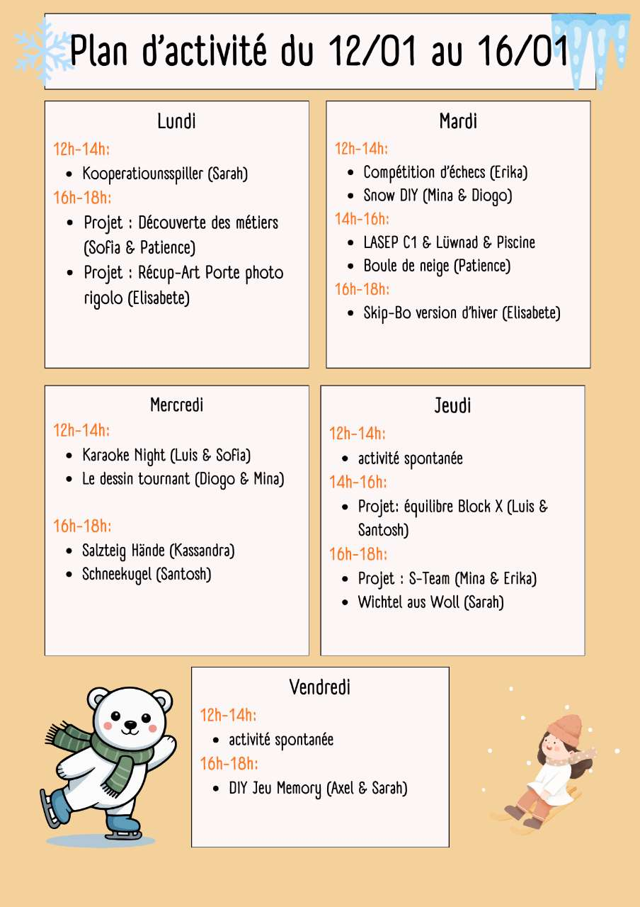 Plan d'activités semaine 12/01/2026 - 16/01/2026