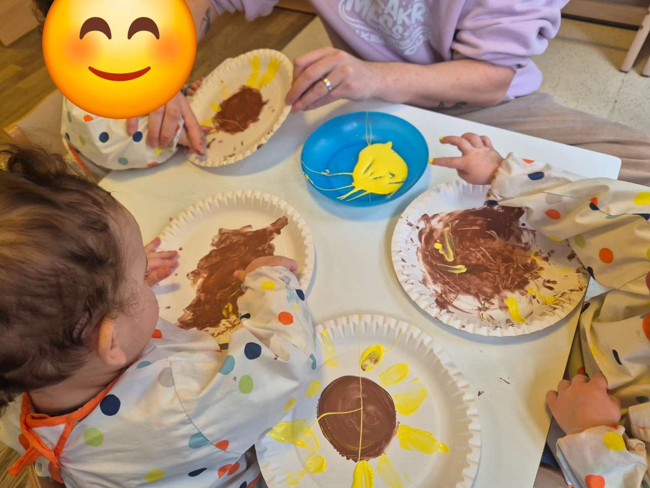 Cette semaine, dans le cadre du projet « Autour du monde », un papa est venu et a peint avec les enfants, avec leurs doigts, le symbole de l’Ukraine : le tournesol. Les enfants ont adoré !