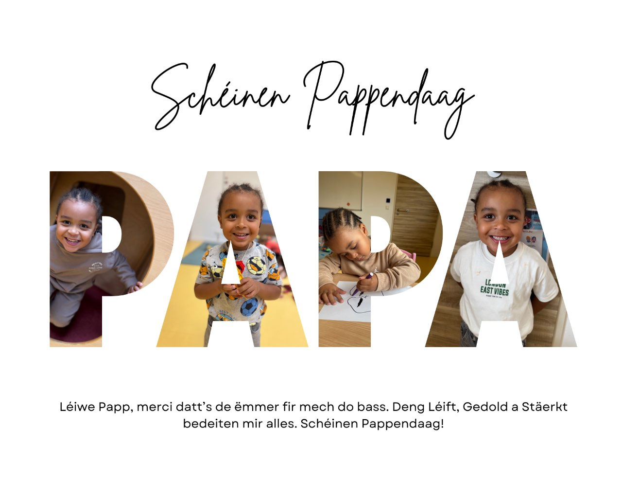 05.10.2025Fir de Pappendag hu mir net nëmmen eifreg gebastelt, mee och eng ganz besonnesch Fotocollage zesummegestallt! Mat vill Freed, Fantasie a Laachen hunn d’Kanner flott Fotoe fir de Pappendag gemaach – a sech dobäi vu hirer beschter Säit gewisen!