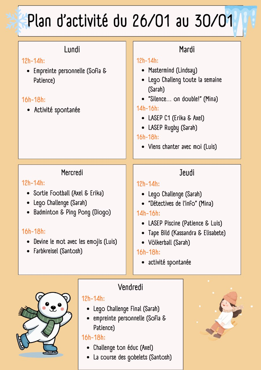 Voici le plan d’activité de cette semaine.