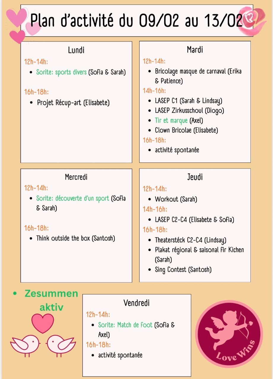 Plan d'activités semaine du 09/02/2026 - 13/02/2026